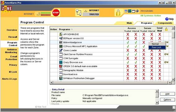 Какво представлява Internet Lock на Zone Alarm. Както пише и в самия Help на програмата, това е “режим, при който само трафика на програмите, които имат pass-lock permission (т.е. имат разрешение да излизат в Интернет дори и в този режим) се разрешава. Спира се всякакъв друг трафик към и от компютъра, включително DHCP съобщения и периодичните сигнали на интернет доставчика, с които се поддържа интернет връзката. В резултат връзката към интернет може да се загуби”.