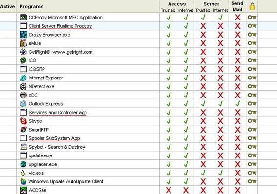 Срещу съответната програма има опции за забраняване (червено кръстче) или разрешаване (зелена отметка) на интернет достъп в нормален режим. Последната колонка, тази с катинарчето, дава pass-lock permission.